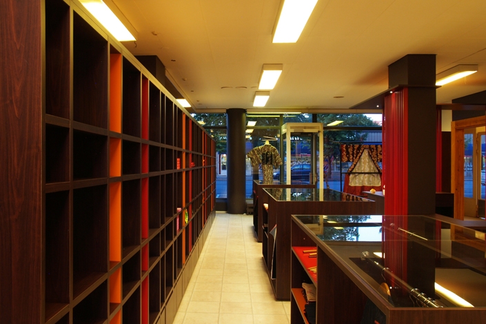 二筋格子のひとつながりの棚には日本の伝統文化・現代文化が並び、茶系に統一された什器に橙・朱色のグラデーションが見え隠れ
